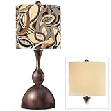 Featuring a distinctive silhouette, this table lamp features a bulbous base finished in dark brown. Working double duty, this lamp comes with two distinct linen shades. Both are made of Brussels linen shade. One shade features a contemporary leaf design in shades of tan and gray while the second is a simple off-white to complement many decors. From the Ambience lighting collection by Minka-Lavery. Textured design base. Dark Brown finish. Includes 2 different linen shades. Takes one 100 watt bulb (not included). On/off switch. 35" high. Shade is 15" across top and bottom, 14" high.
